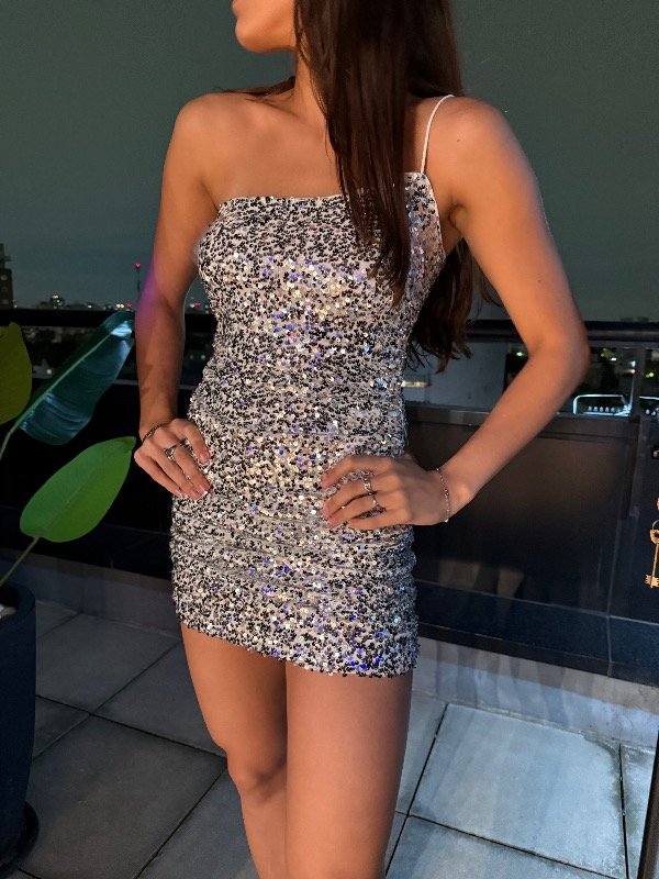 Vestido ajustado de lentejuelas rojas, de un solo hombro.