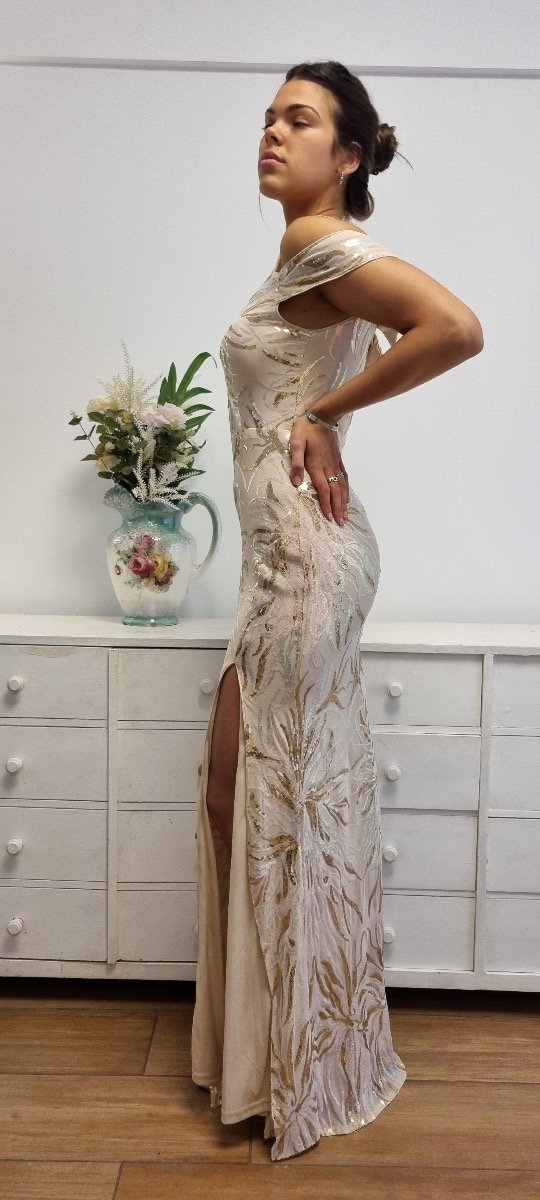Espectacular vestido de fiesta de hombros descubiertos, con una atrevida abertura en el muslo, está adornado con deslumbrantes lentejuelas. Este diseño es la elección perfecta para quienes buscan un look glamoroso y audaz en cualquier evento especial.