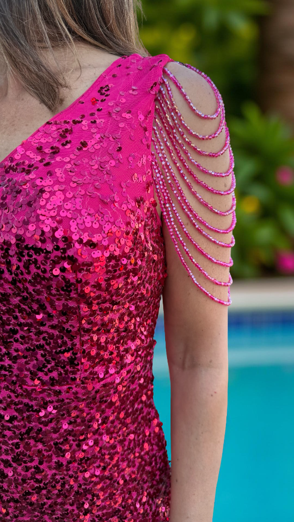 Este deslumbrante vestido largo de lentejuelas es perfecto para las ocasiones más especiales. Con un corte sirena y un ajuste semielastizado que realza tu figura, el talle alto de este vestido estiliza tu silueta. El escote en V agrega un toque de sensualidad, mientras que la espalda abierta añade un detalle elegante y sofisticado. El acabado de lentejuelas hace que este vestido sea verdaderamente espectacular, creando un efecto de brillo y destello que hará que te destaques en cualquier evento. Si buscas un look impresionante que no pase desapercibido, este vestido de lentejuelas es la elección perfecta.